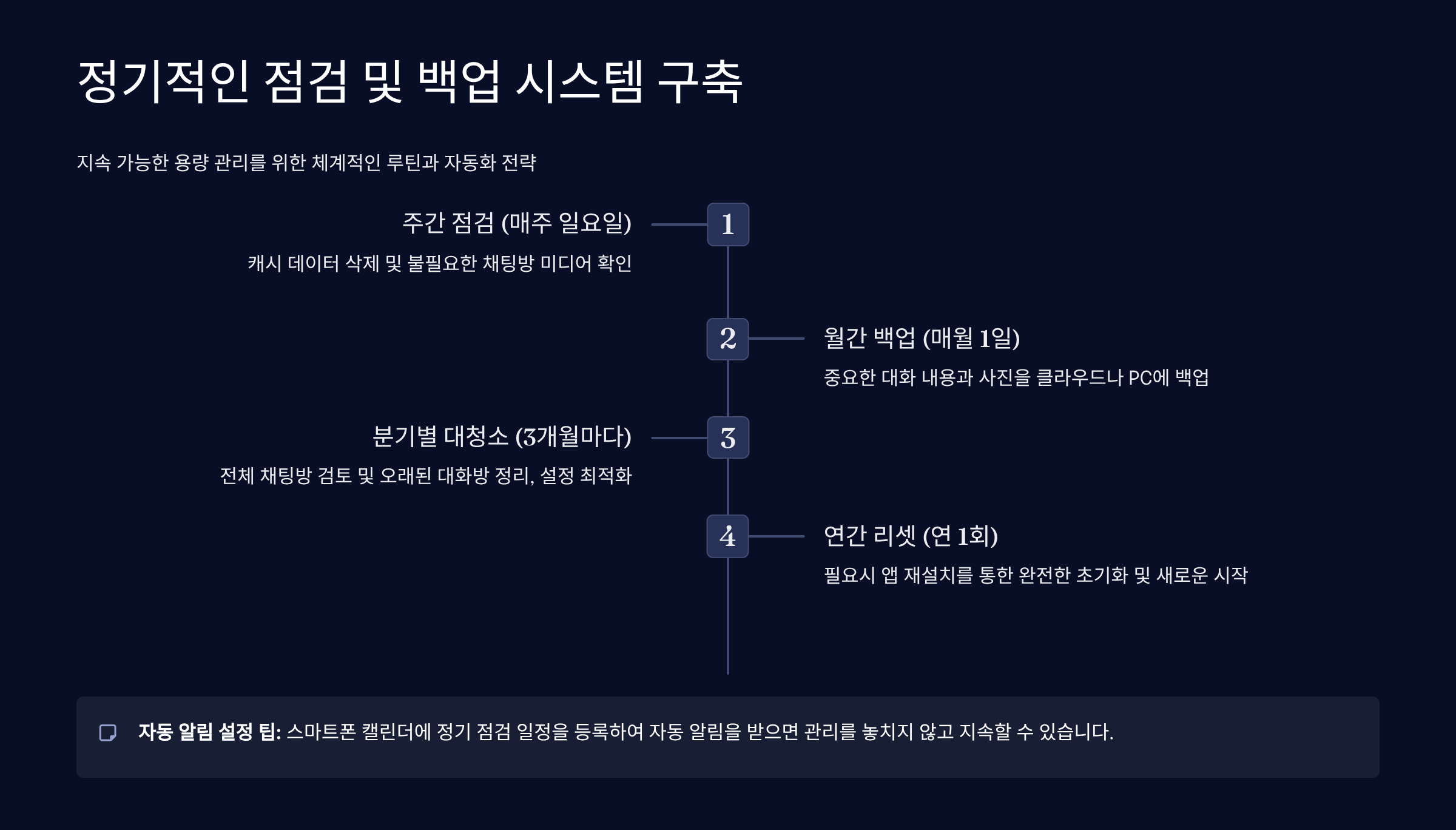 카카오톡 용량 문제를 일회성 이벤트가 아닌 **지속 가능한 관리 시스템**으로 전환하는 것이 궁극적인 해결책입니다. 앞서 제시된 모든 팁들을 적용한 후에는, **월 1회 정기 점검**을 통해 카카오톡 캐시를 삭제하고, 용량이 비대해진 채팅방을 주기적으로 정리하는 습관을 들여야 합니다. 특히 가장 중요한 것은 **채팅 백업 시스템을 완벽하게 구축**하는 것입니다. 카카오톡의 '설정' → '채팅' → '대화 백업' 기능을 활용하여 중요한 채팅 기록을 정기적으로 백업하고, 미디어 파일(사진, 동영상)은 구글 포토, 네이버 마이박스 등의 클라우드 서비스로 자동 동기화되도록 설정해 두어야 합니다. 이렇게 이원화된 백업 시스템이 갖춰지면, 언제든지 안심하고 '앱 삭제 후 재설치'와 같은 극단적인 용량 확보 방법을 사용할 수 있게 됩니다. 백업 시스템 구축은 단순한 용량 확보를 넘어, 스마트폰 분실이나 고장 등 만일의 사태에도 중요한 디지털 자산을 안전하게 보호하는 **디지털 라이프의 필수적인 안전장치**입니다. 이 시스템을 통해 카카오톡 용량 관리를 넘어선 개인 디지털 데이터 관리의 전문가가 될 수 있습니다. (총 공백 포함 419자)