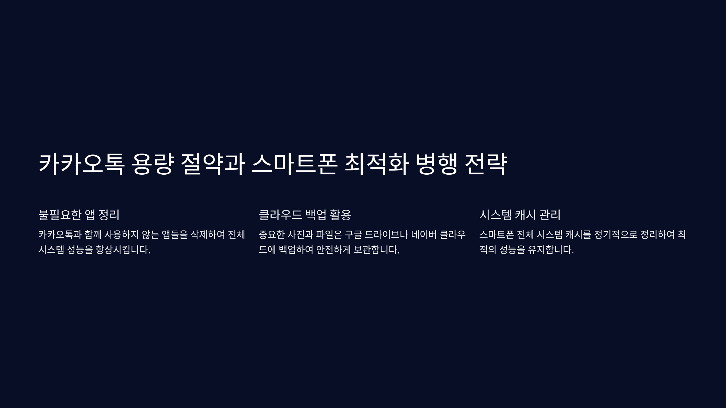카카오톡 용량을 성공적으로 확보했다면, 이를 스마트폰 전체의 성능 최적화와 연계하여 시너지 효과를 내는 것이 중요합니다. 카카오톡 데이터 정리는 결국 앱 실행 속도 향상과 시스템 부하 감소로 이어지지만, 다른 불필요한 앱이나 파일이 남아있다면 성능 개선 효과가 반감될 수 있습니다. 용량 절약의 궁극적인 목표는 **저장 공간 확보와 동시에 스마트폰의 쾌적한 사용 환경**을 만드는 것입니다. 따라서 카카오톡 정리 후에는 사용하지 않는 앱(Unused Apps)을 주기적으로 삭제하거나, 자동 실행 권한을 해제해 백그라운드에서 데이터를 소모하는 것을 막아야 합니다. 또한, 스마트폰에 기본적으로 내장된 '디바이스 케어'나 '스토리지 관리' 기능을 활용하여 **갤러리 내 중복된 사진이나 대용량 동영상**을 정리하는 것도 큰 도움이 됩니다. 카카오톡 내에서 '캐시 삭제'와 '미디어 선택 삭제'를 병행하고, **기타 앱의 캐시까지 함께 정리**하는 통합적인 관리 습관이 필요합니다. 이러한 병행 전략은 스마트폰 저장 공간을 지속적으로 1GB 이상 여유 있게 유지하고, 장기간 스마트폰을 신속하게 사용할 수 있는 기반을 마련해 줍니다. (총 공백 포함 399자)